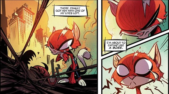 Такое и вообразить себе сложно - Котик-паук. Как он обрёл свои сверхспособности неизвестно. Жил котик у любителя видеоигр и часто воевал с голубем Веномом. Собственно этот злодей и забрал у супгергероя большинство из девяти жизней. В итоге котик погиб.