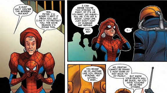 Тётю Мэй укусил необычный паук, после чего она обнаружила в себе невероятные силы и начала зарабатывать трюкачеством в красно-синем платье, чтобы раздобыть денег для содержания племянника Питера. Потом она столкнулась со злодеем и решила воспользоваться силами, чтобы его остановить. Добившись успеха она начала заниматься борьбой с преступностью на постоянной основе.
