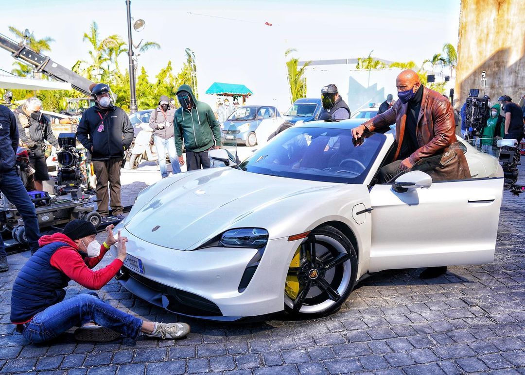 К слову, за первым фото кроется целая история о производственном форс-мажоре. Для сцены погони персонажу Джонсона прикупили крутейшее Porsche Taycan. На приобретение и доставку ушли немалые средства, уйму времени потратили на подготовку сцены. А когда настал момент съёмок, выяснилось, что Скала попросту не умещается в авто. В итоге, по заверению Джонсона, команда проявила творческий подход и сняла-таки задуманное. Креатив — наше всё.